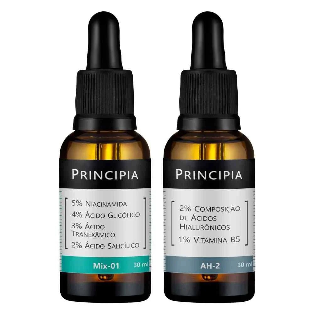 Kit com um sérum com 2% de Ácidos Hialurônicos + 1% de Vitamina B5 e um sérum Mix-01 com uma associação de quatro ativos, em caixa de presente.