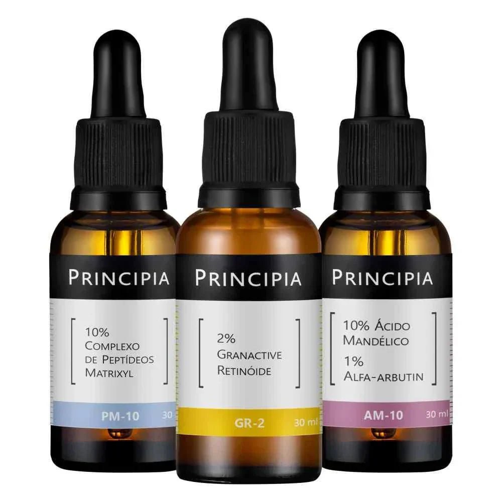 Kit com três fórmulas: uma emulsão com Granactive Retinóide, um sérum com Ácido Mandélico + Alfa-arbutin e um sérum com Peptídeos Matrixyl, em caixa de presente.